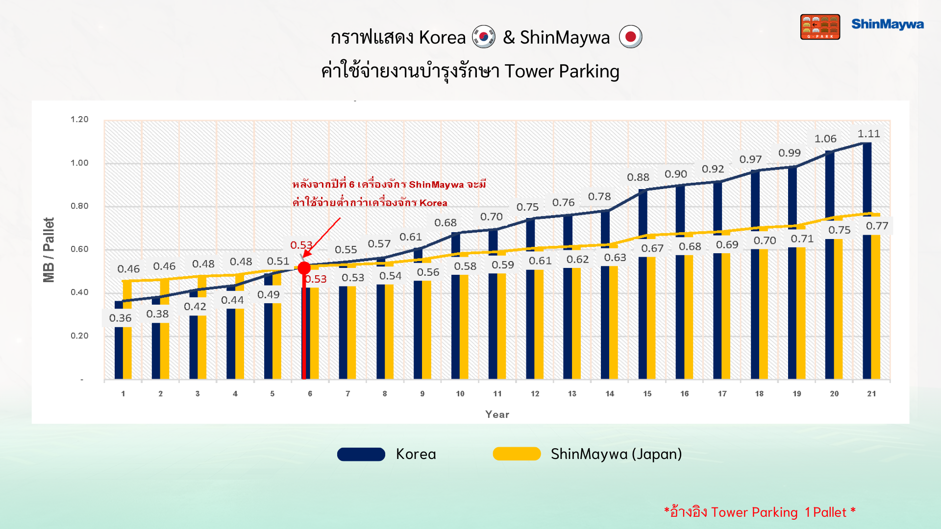 จากกราฟแสดงให้เห็นว่าหลังจาก ปีที่6 ค่าใช้จ่ายงานบำรุงรักษาเครื่องจักรจากประเทศญี่ปุ่นต่ำกว่าประเทศเกาหลี