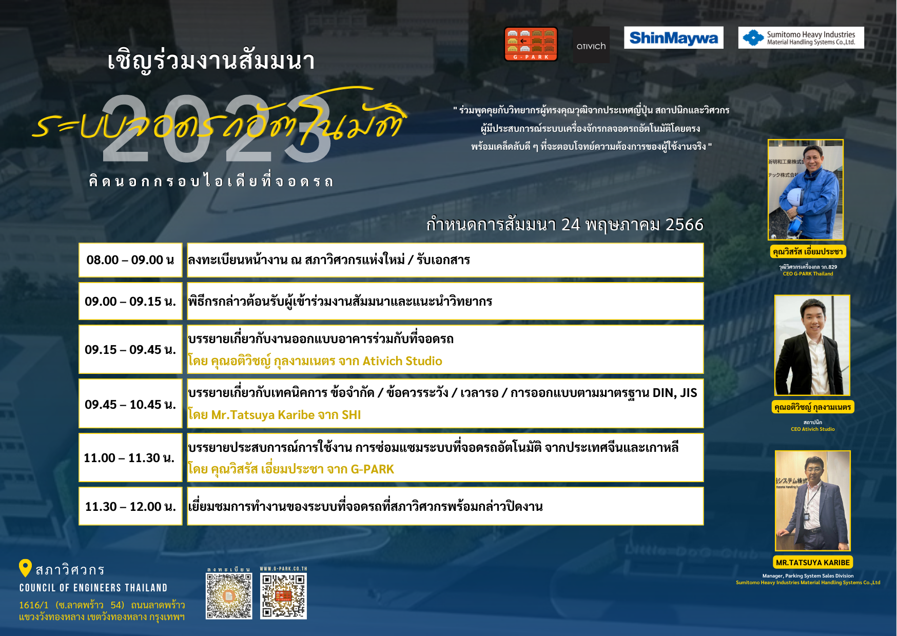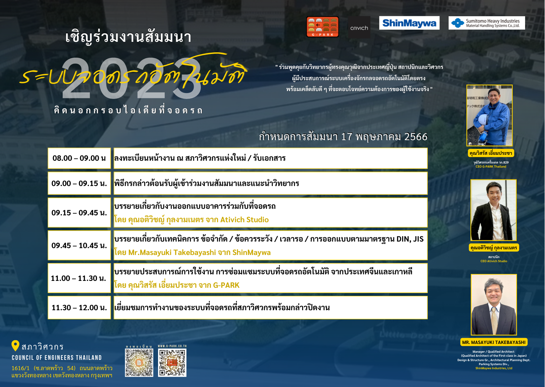 เปิดงานสัมมนาความรู้ ในเรื่องการออกแบบ ติดตั้ง บำรุงรักษาระบบจอดรถอัตโนมัติ โดยมี คุณวิสรัส เอี่ยมประชา ประธานบริษัท ระบบที่จอดรถอัตโนมัติทั่วไป จำกัด (G-PARK Thailand) , คุณอติวิชญ์ กุลงามเนตร สถาปนิก จาก Ativich Studio เข้าร่วมงานสัมมนาครั้งนี้ด้วยร่วมถึงวิทยากรที่จะมาให้ความรู้จากประเทศญี่ปุ่น โดยงานแบ่งออกเป็นสองวันดังนี้