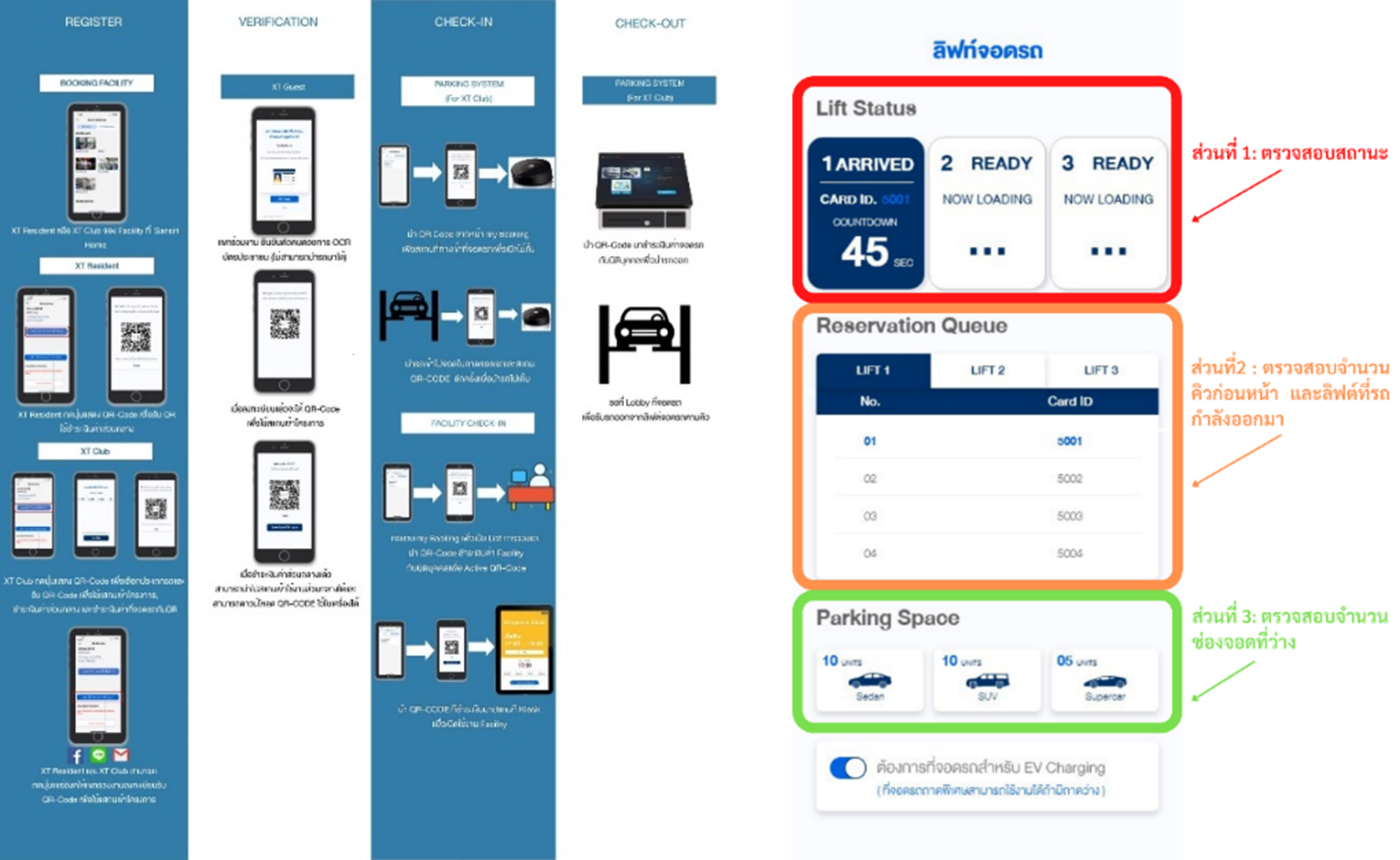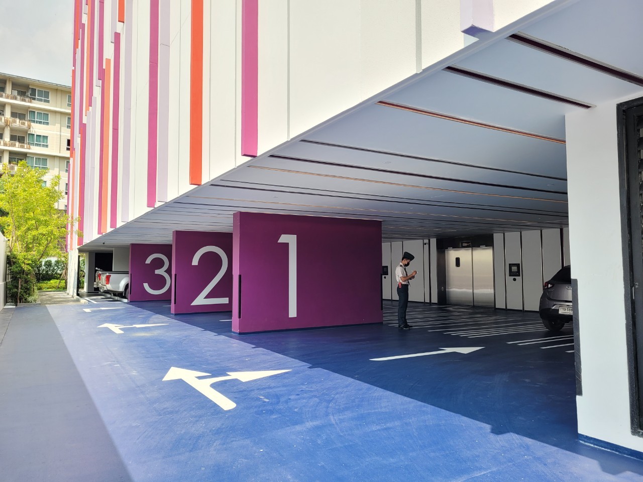 ป้าย Parking Status ระบบแสดงจำนวนช่องจอดรถที่ว่างของรถแต่ละประเภทเมื่อระบบตรวจสอบว่าเป็นรถประเภทใด ระบบแสดงขึ้นจอ Parking Status ให้ไปยังช่องลิฟต์ที่ว่าง มีความแม่นยำและประหยัดเวลามากขึ้น