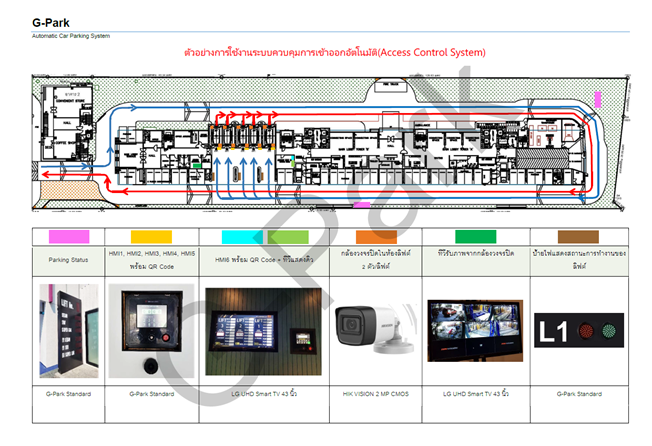 ซึ่งทางพาร์ค G-PARK ได้พัฒนาโปรแกรมซอฟต์แวร์ระบบจอดรถอัตโนมัติควบคู่ไปกับระบบการจัดการควบคุมการเข้า/ออก ดังนั้นบางโครงการจะใช้ระบบจอดรถอัตโนมัติควบคู่ไปกับระบบ Access Control หรือบางโครงการอาจมีไม่มีก็ได้นอกจากนี้ ยังสามารถเชื่อมต่อระบบ Access Control กับ Application ของลูกค้าได้อีกด้วย